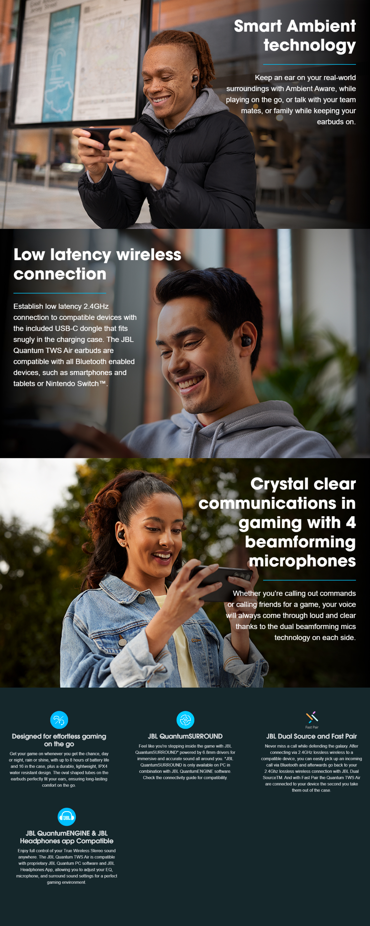 Establish low latency 2.4GHz connection to compatible devices with the included USB-C dongle that fits snugly in the charging case. The JBL Quantum Air TWS earbuds are compatible with all Bluetooth enabled devices, such as smartphones and tablets or Nintendo SwitchTM.