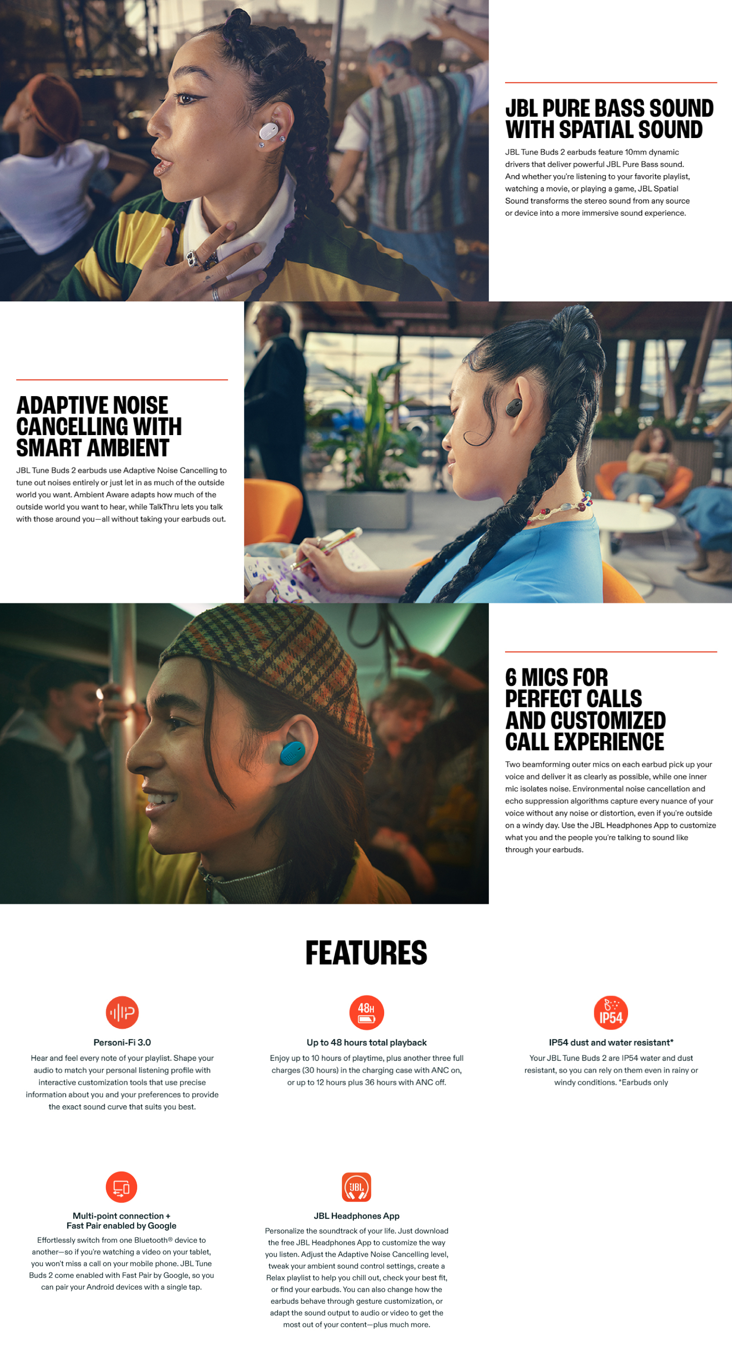 JBL Tune Buds 2 earbuds feature 10mm dynamic drivers that deliver powerful JBL Pure Bass sound. And whether you're listening to your favorite playlist, watching a movie, or playing a game, JBL Spatial Sound transforms the stereo sound from any source or device into a more immersive sound experience.