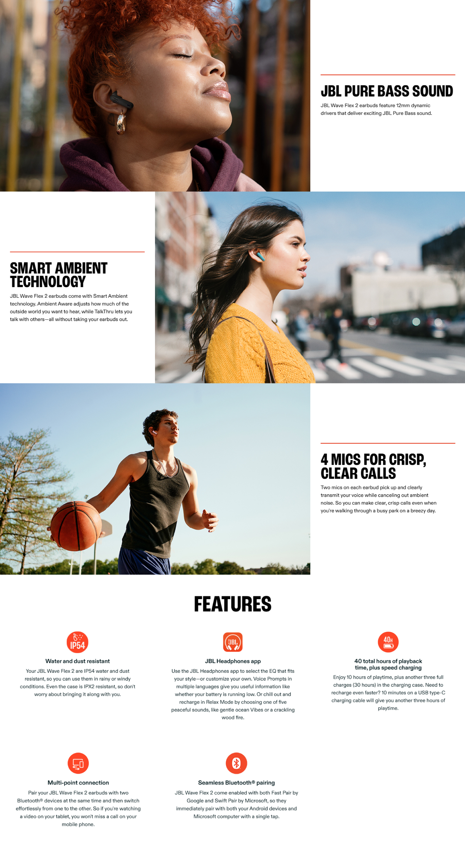 JBL Wave Flex 2 earbuds come with Smart Ambient technology. Ambient Aware adjusts how much of the outside world you want to hear, while TalkThru lets you talk with others—all without taking your earbuds out.