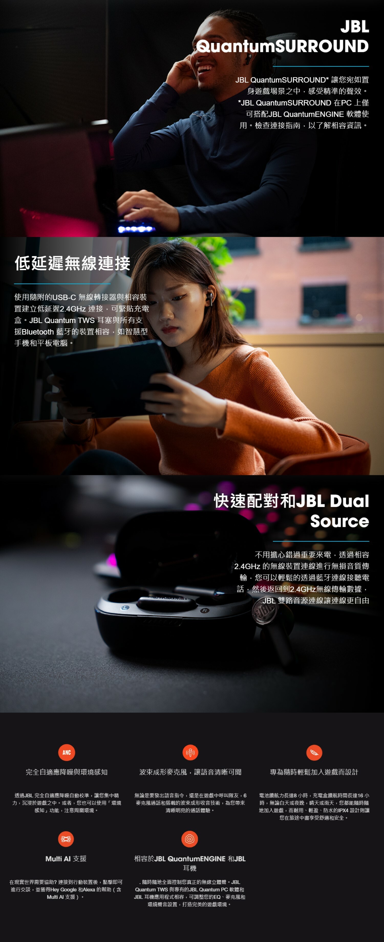 *JBL QuantumSURROUND 在 PC 上僅可搭配 JBL QuantumENGINE 軟件使用。檢查連接指南,了解兼容信息。