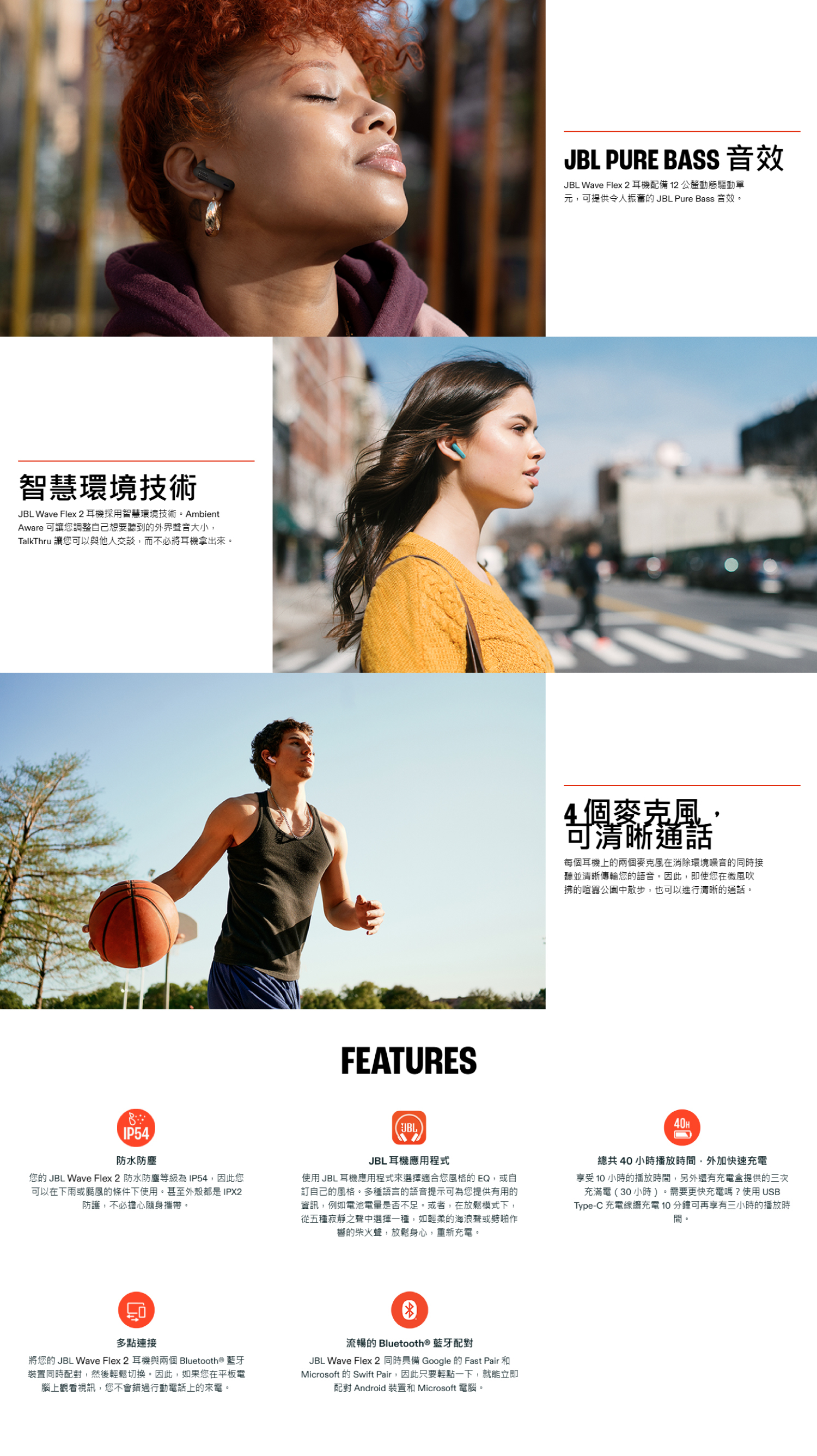 您的 JBL Wave Flex 2 防水防塵等級為 IP54,因此您可以在下雨或颳風的條件下使用。甚至外殼都是 IPX2 防護,不必擔心隨身攜帶。